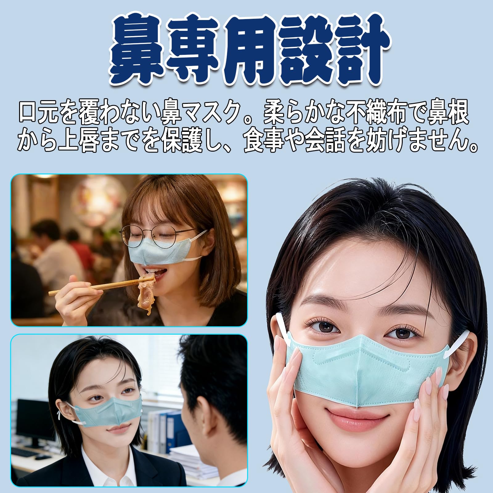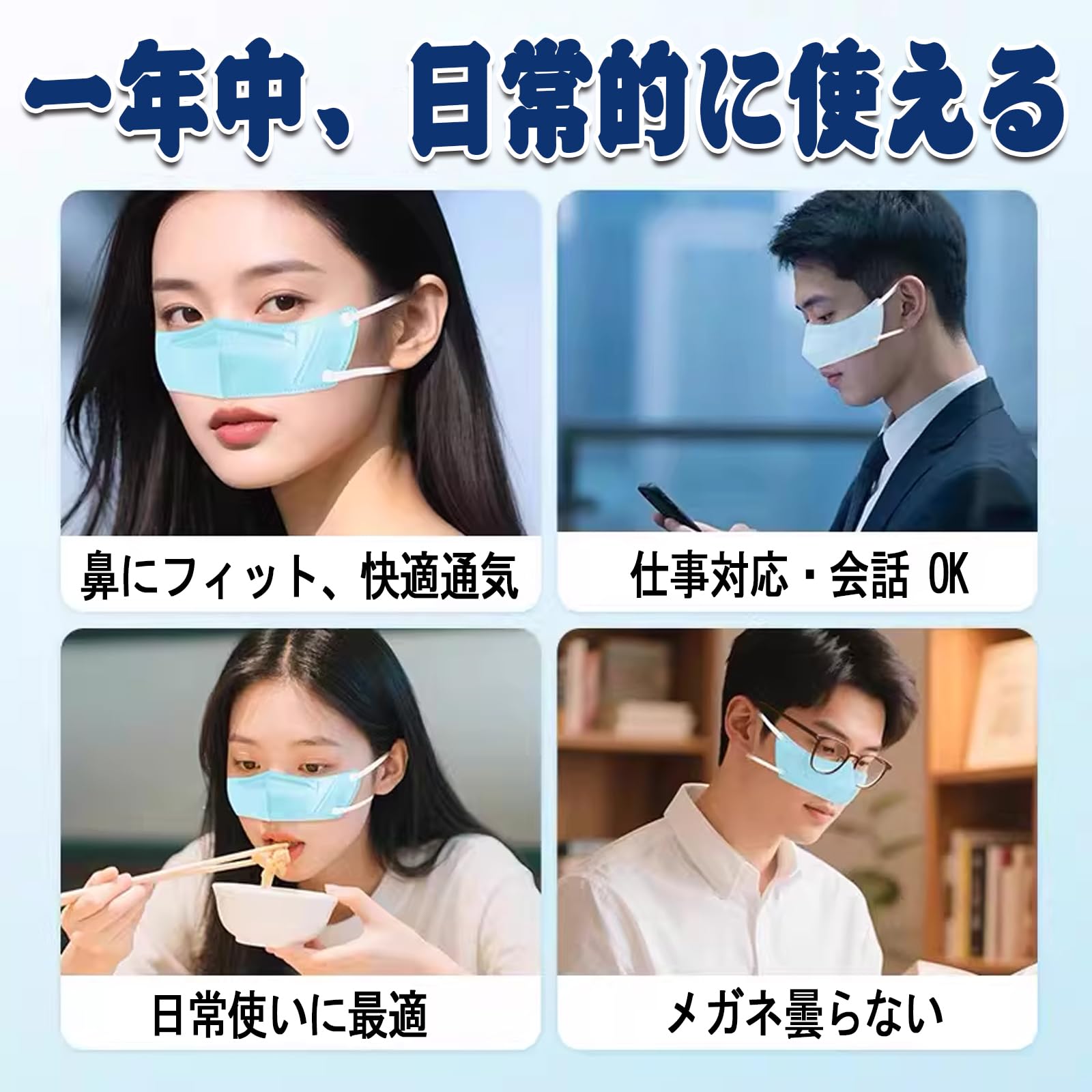 - 【鼻専用快適マスク】花粉や乾燥シーズンに最適な鼻専用マスク。鼻の付け根から上唇付近をやさしく覆い、口元は開放された設計のため、メガネの曇りを軽減。テレワーク時にも邪魔にならない鼻だけマスクです。