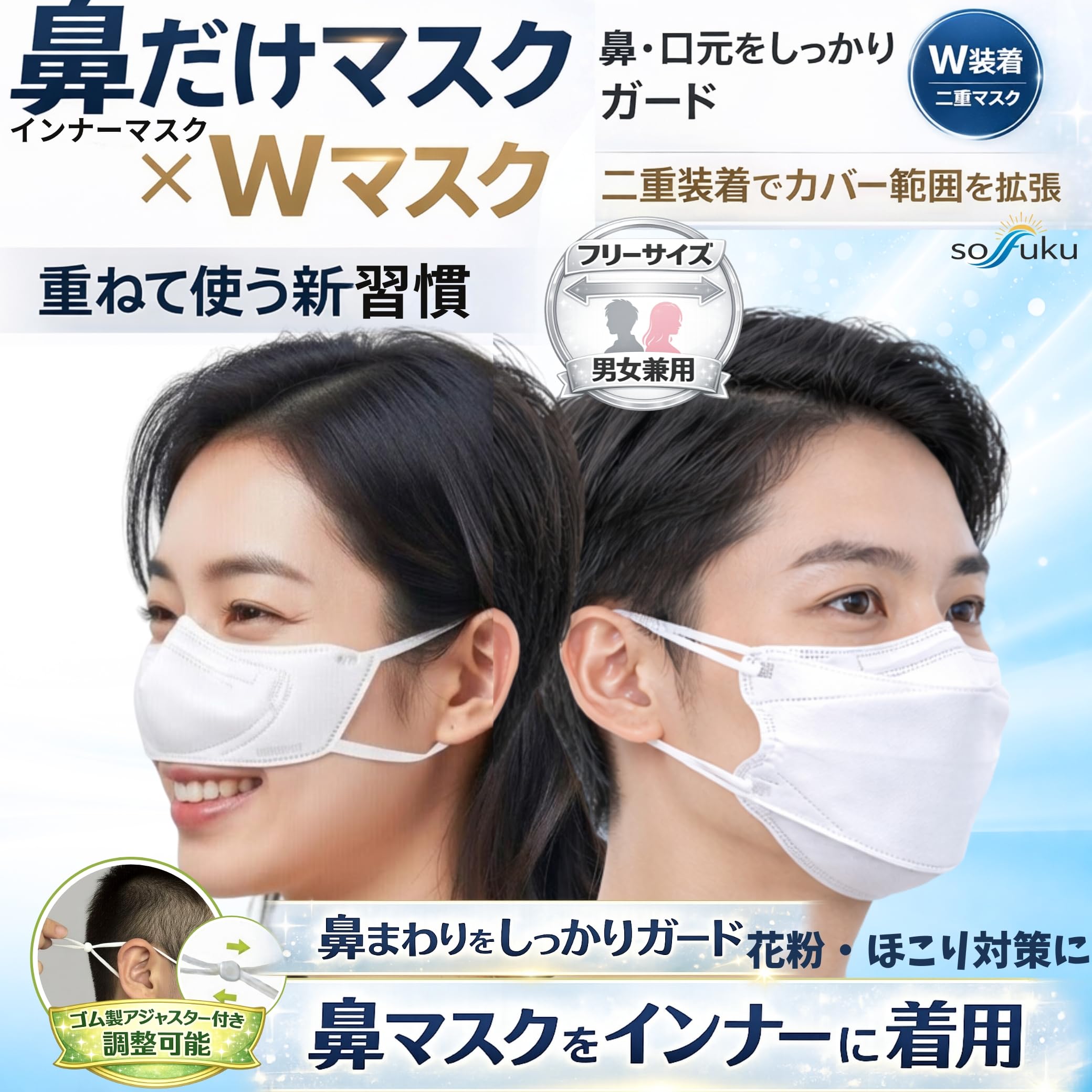鼻の付け根から上唇付近までを覆い、口元を覆わない構造 - 花粉・ホコリ対策を意識した物理的遮り