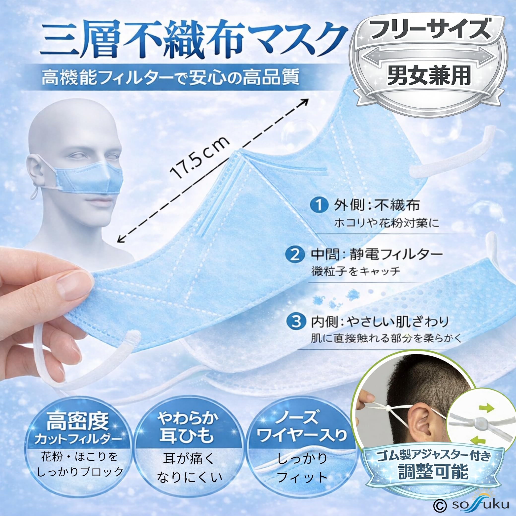 直接肌に触れることを考慮した素材選定 - 耳掛けゴム付きで装着しやすい